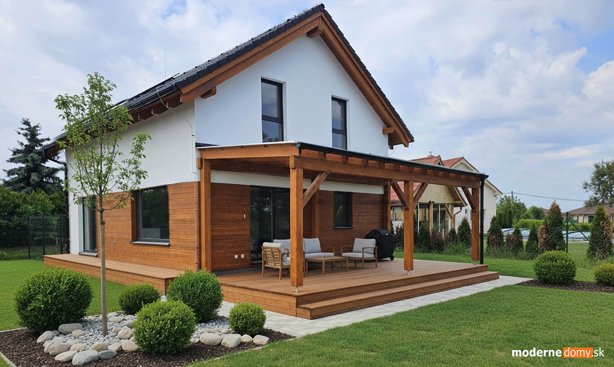 Architektúra pracuje s priznanými prvkami krovu, ktoré dodávajú stavbe charakteristický rytmus a nádych poctivého remesla. Veľké presklenia nie sú len estetickým prvkom; fungujú ako neviditeľná bariéra, ktorá stiera hranicu medzi interiérom a exteriérom. Drevená terasa, plynule nadväzujúca na obytné miestnosti, rozširuje životný priestor do zelene a vytvára ideálne miesto pre rannú kávu alebo večerné rozhovory pod hviezdami.