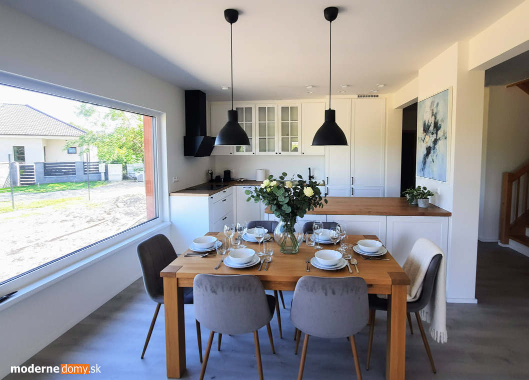 Hneď pri vstupe vás privíta praktické zádverie so samostatným technickým zázemím a toaletou, čo zaručuje čistotu a poriadok v hlavnej časti domu. Srdce domova tvorí otvorený koncept kuchyne s jedálňou dominuje prízemiu. Kuchynský ostrov sa tu stáva prirodzeným centrom stretávania, zatiaľ čo jedáleň je zaliata svetlom vďaka priamemu prepojeniu s terasou.