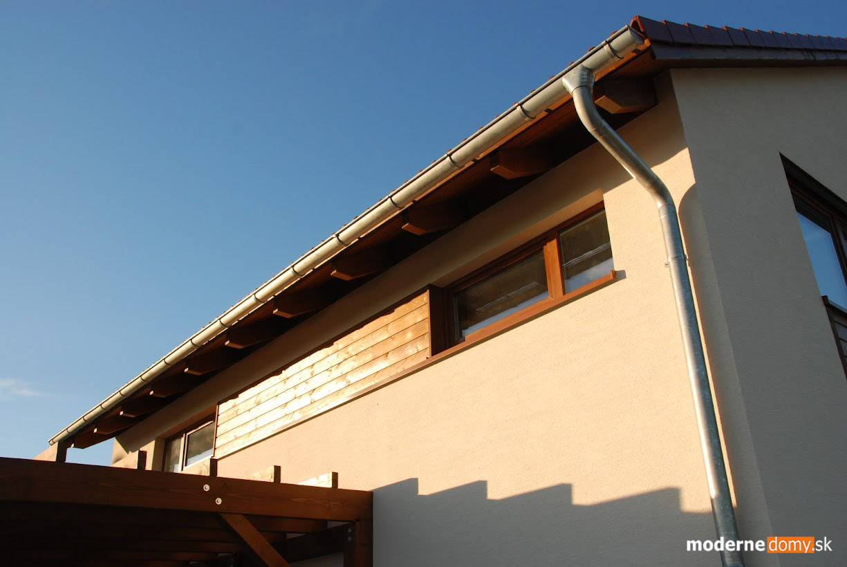 Drevený obklad nie je len vkusným, ale aj praktickým doplnkom. Na južnej strane fasády ukrýva vonkajšie žalúzie od spoločnosti Isotra, ktoré bránia prehrievaniu interiéru v horúcich letných dňoch a v spálňach regulujú aj množstvo svetla podľa požiadaviek obyvateľov.