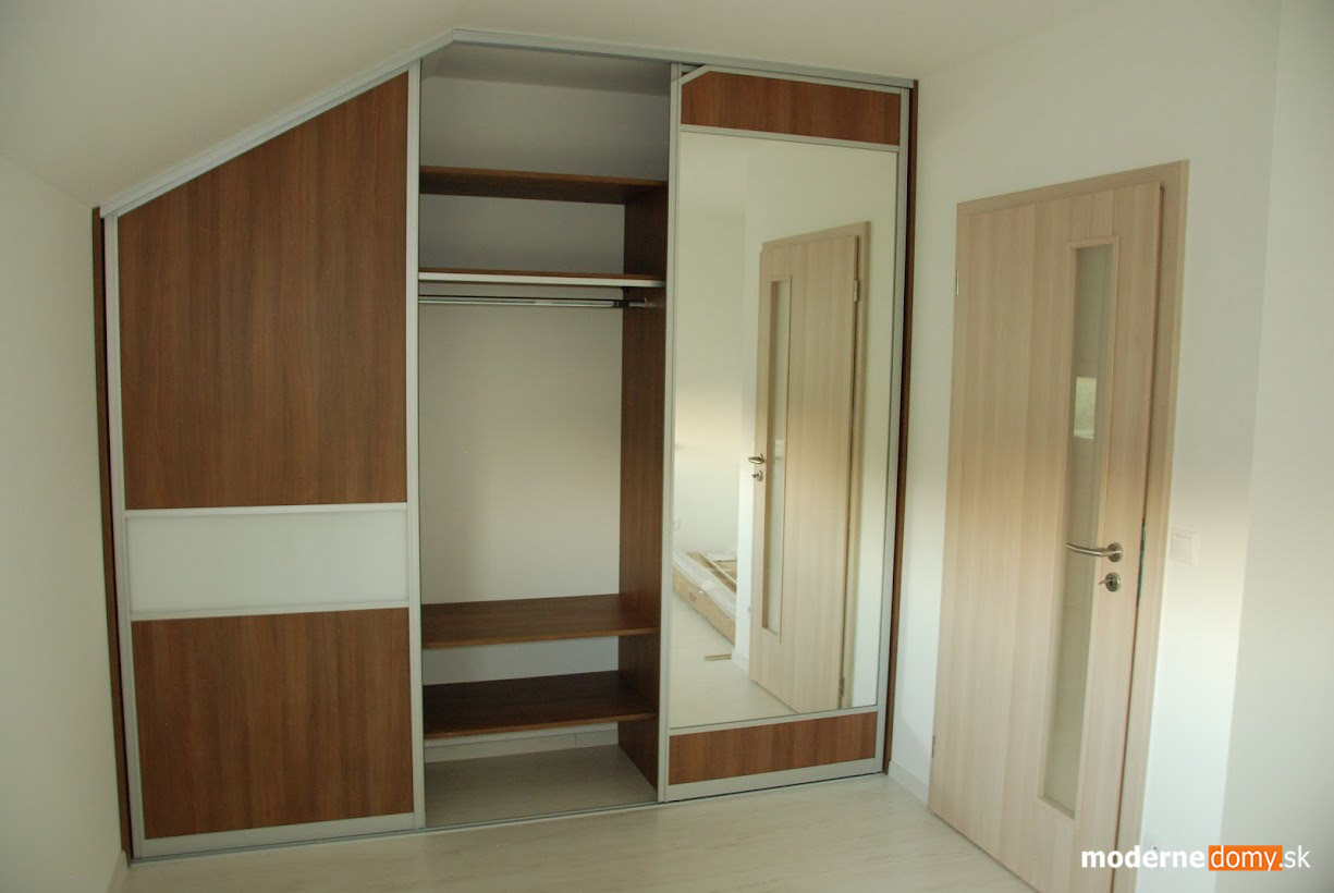 Okrem kuchynskej linky vieme dom odovzdať aj so šatníkmi – tieto šatníkové skrine dodala naša dcérska spoločnosť ModerneByvanie.sk prostredníctvom jej partnerov, ktorý urobia akýkoľvek nábytok na mieru do drevodomu.