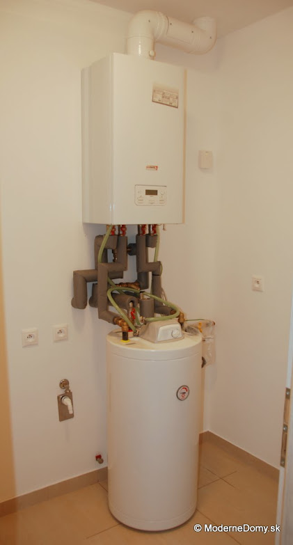 Plynový kotol so zásobníkovým ohrevom teplej úžitkovej vody zaberá minimum miesta v technickej miestnosti a tak je tu ešte miesto na práčku a uskladnenie potrebných drobností.