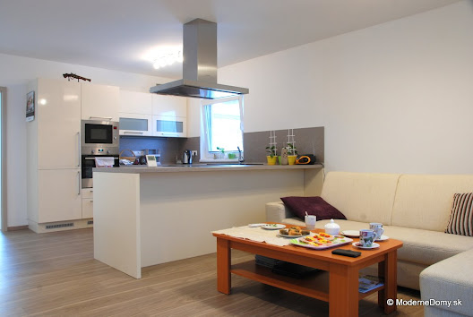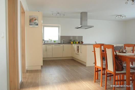 Veľkoryso riešené vnútorné priestory domu spolu s citlivo vyberanými dekormi a materiálmi podčiarkujú dostatok priestoru a svetelnú a tepelnú pohodu v interiéri. Kuchynská linka bola dodaná spolu s domom tiež prostredníctvom ModerneDomy.sk a je z dielne úspešnej moravskej značky Lamont.
